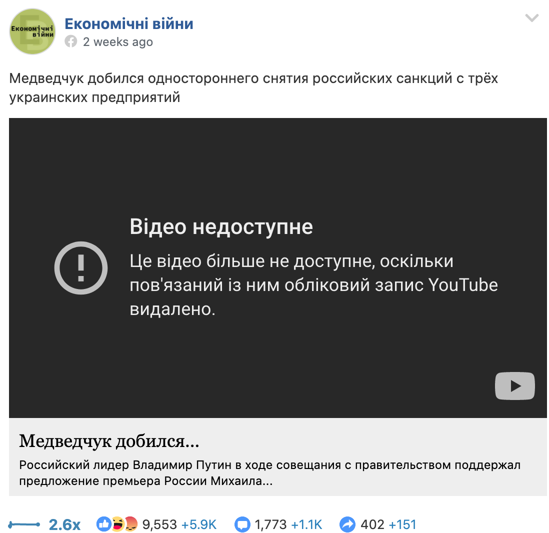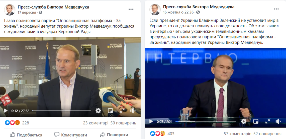 Водночас так само активно розповсюджувала ці самі дописи сторінка, яка має назву  Пресс-служба Виктора Медведчука. Відмінним є те, що ці повідомлення не були виставлені на рекламу.