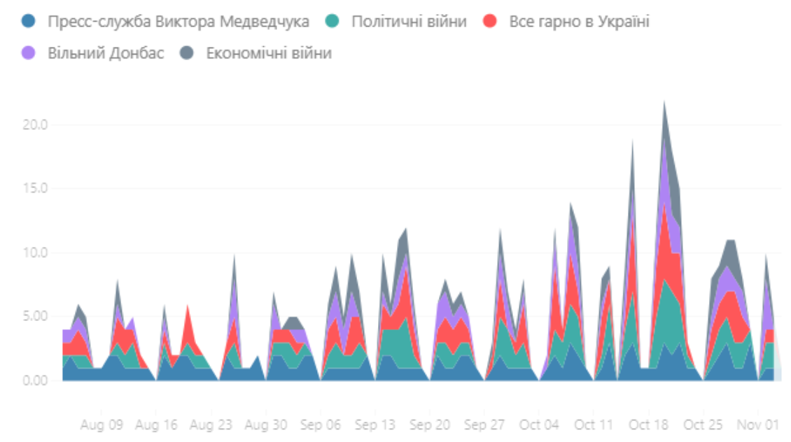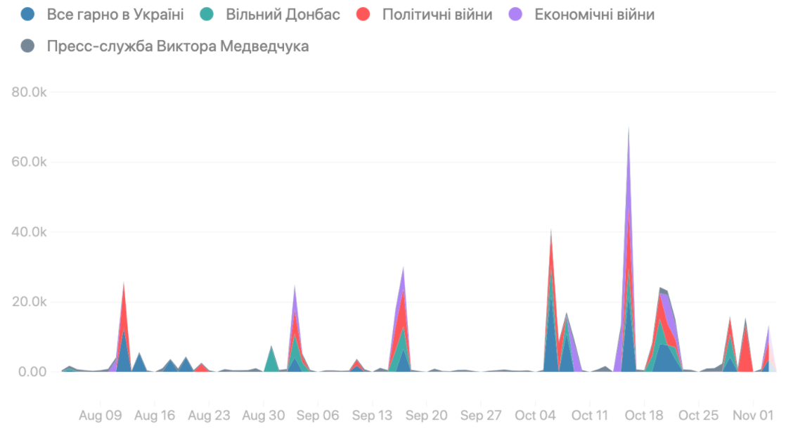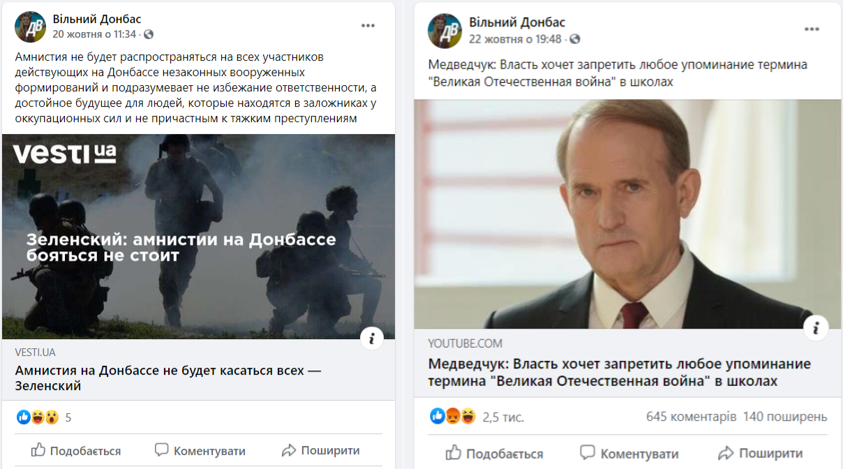 Проаналізувавши активність п’яти сторінок за серпень-жовтень 2020 року у Crowdtangle (аналітичний інструмент для дослідження Facebook-середовища), ми виявили дописи, що мали незвичайну активність: нетипово велику кількість коментарів, лайків, реакцій, репостів. Якщо більшість дописів на сторінці Вільний Донбас мала менш як 15 лайків і жодного коментаря, деякі пости набирали понад 2,5 тисячі лайків і близько 600 коментарів. За дивним збігом обставин, привертають таку увагу користувачів лише дописи зі згадкою про Медведчука: