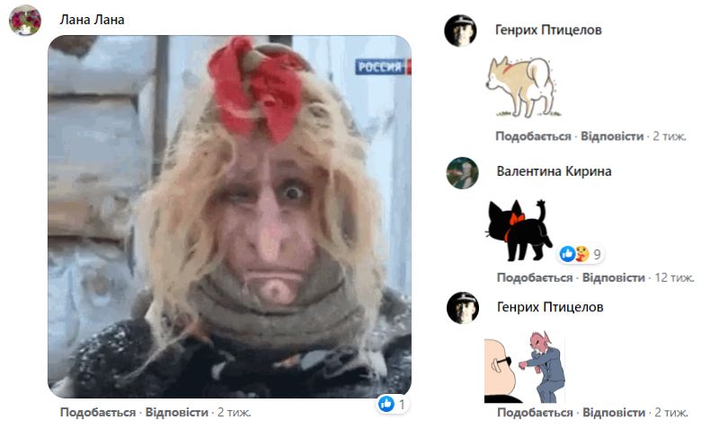 Схоже до попередніх акаунтів діяли Ігор Бородавчук та Василь Векерик. Інші користувачі, на нашу думку, створювали штучну активність на цих  п’яти сторінках, поширюючи GIF-зображення або смайлики, якими демонстрували власне незадоволення. Наприклад, Валентина Кирина, яка опублікувала загалом 27 коментарів, Генрих Птицелов (75 коментарів), та Лана Лана (10 коментарів):