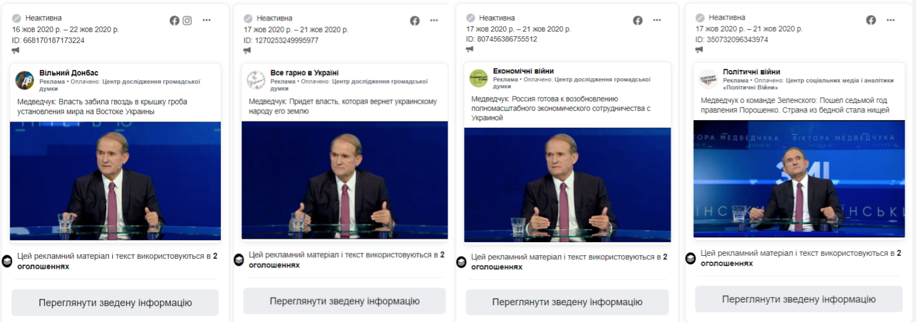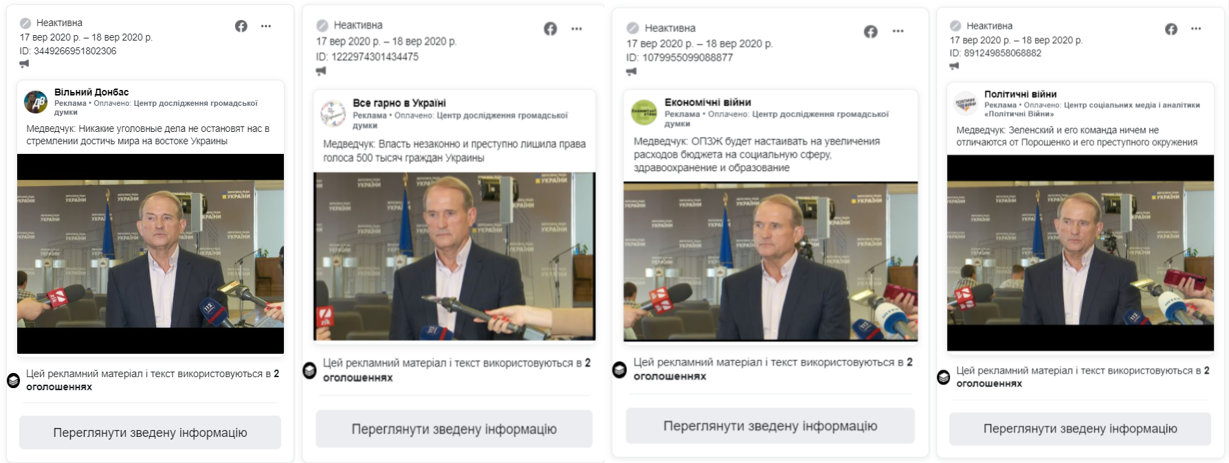 Перша ознака – однакові матеріали, котрі поширювали усі п’ять сторінок приблизно в той самий час. Наприклад, сторінки Політичні війниВільний ДонбасЕкономічні війниВсе гарно в Україні 17 вересня розпочали трансляцію реклам, що містили відео із коментарями Віктора Медведчука щодо миру на Донбасі, місцевих виборів у цьому регіоні та низки інших питань. Варто відзначити, що коментували адміністратори сторінок їх по-різному – вставляючи різні цитати з відео до заголовка кожної з реклам: