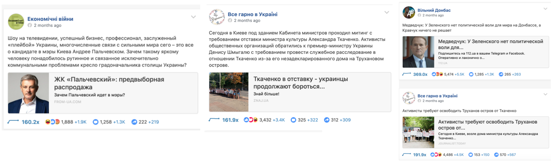 Вищезгадані чотири Facebook-сторінки були активні та використовували послугу політичної реклами і під час кампанії місцевих виборів – 2020. За даними Бібліотеки реклами Facebook, в період з 5 вересня по 23 жовтня їх витрати на політичну рекламу склали майже 14 тисяч доларів (400 тисяч гривень). Найбільше інвестували сторінки  Політичні війни (4708 $) та Все гарно в Україні (4461 $), дещо менше витратили Економічні війни (2089 $) та Вільний Донбас (2715 $). Пости на сторінках, очікувано, агітували за політичну силу, де Віктор Медведчук є головою політради, – “Опозиційну платформу – За життя”, а критика лунала переважно щодо центральної влади та  чинного президента Володимира Зеленського особисто. Втім, інколи діставалося й іншим учасникам виборчих перегонів, як-от Андрію Пальчевському, герою одного з попередніх текстів ОПОРИ:
